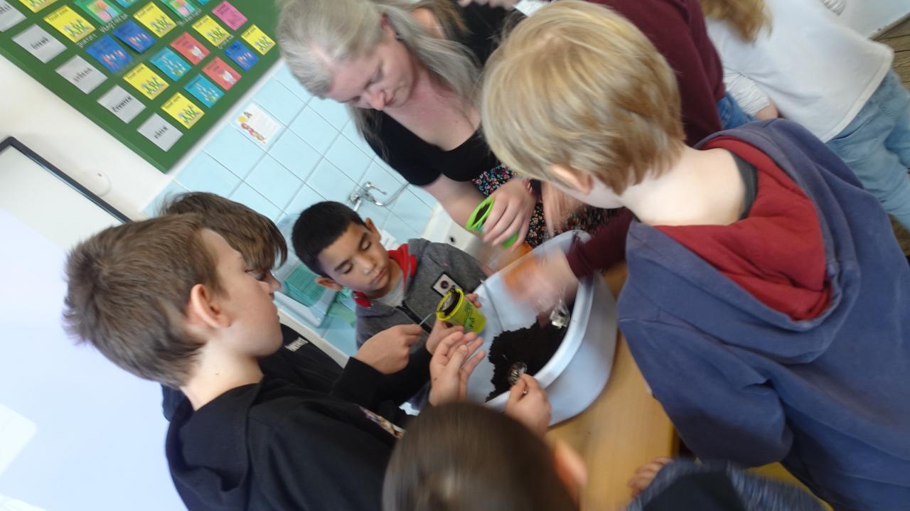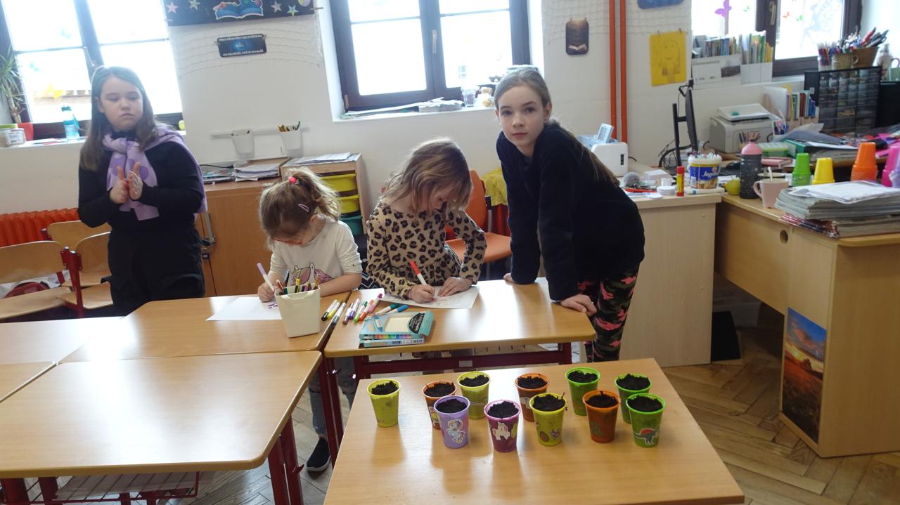 Veverky z Veselé školky zasévají řeřichu s žáky ze ZŠ Komenského ve Skutči