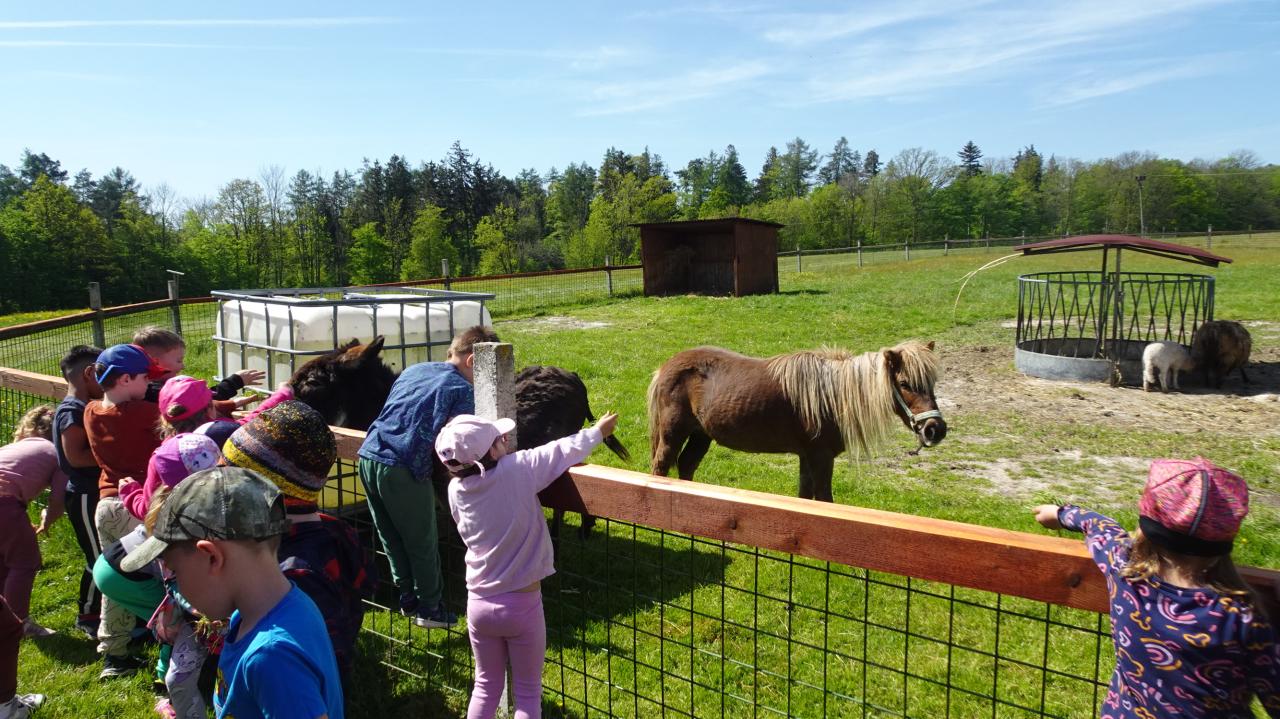 Také děti z třídy Veverek navštívily Dědečkovu obůrku a Babiččin dvoreček. Nakrmily všechna zvířátka (s některými se pomazlily - králíček), obešly celý areál a seznámily se s činnostmi na statku.