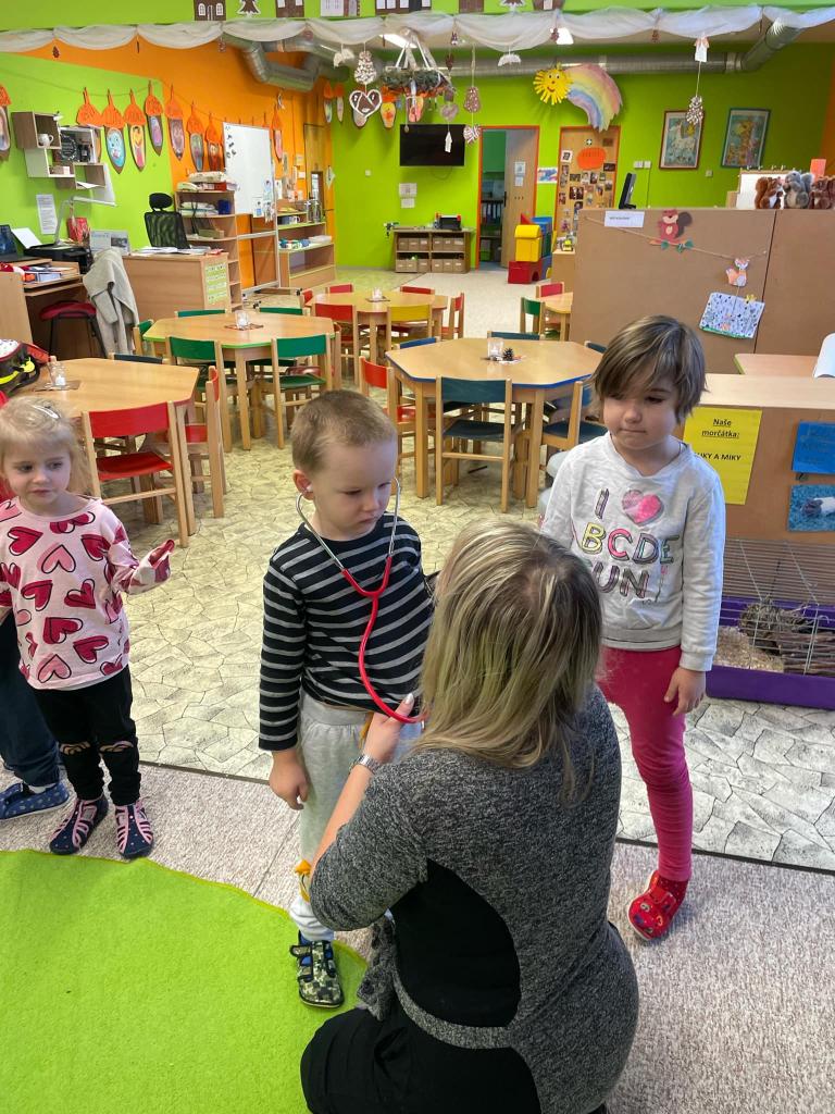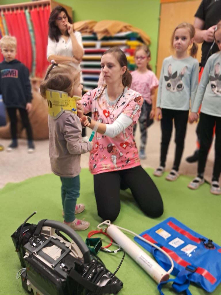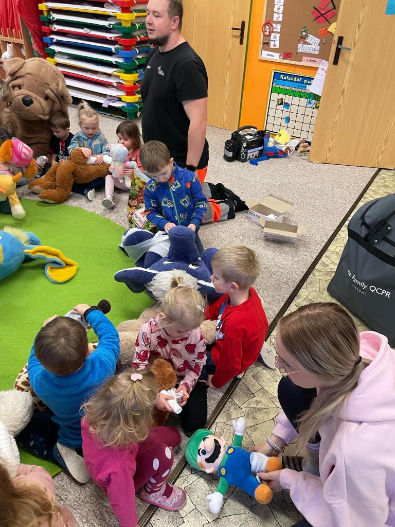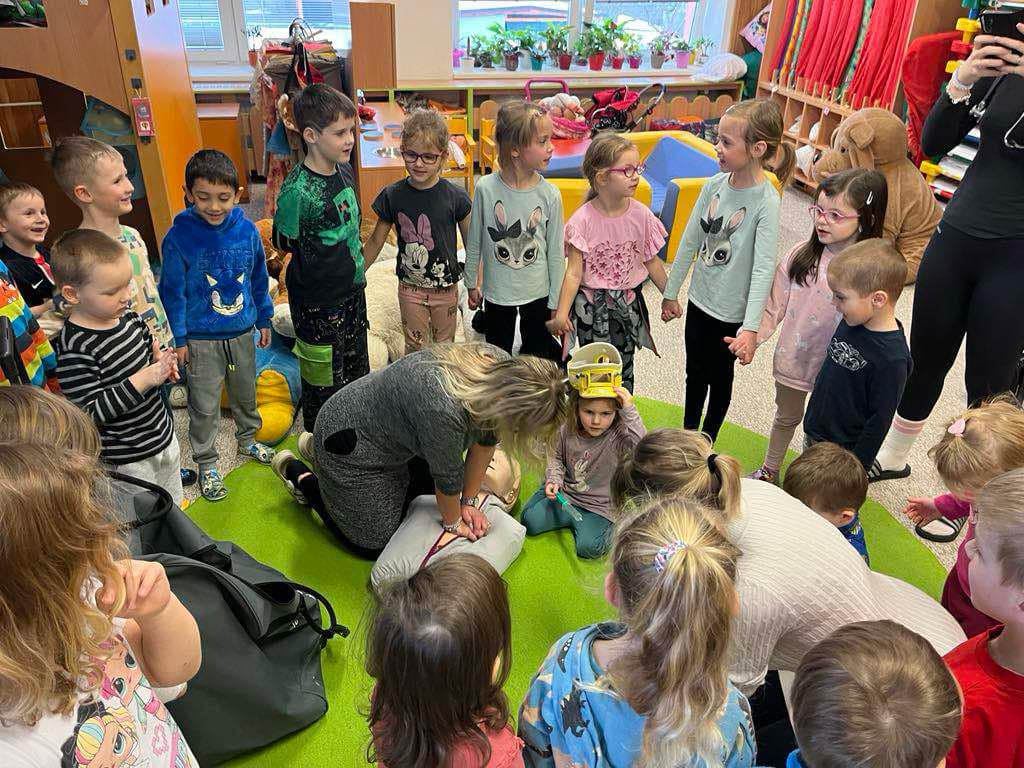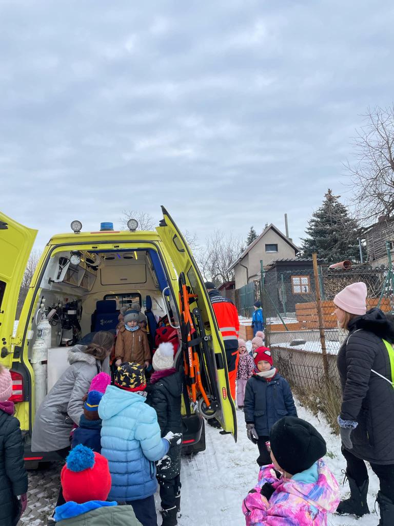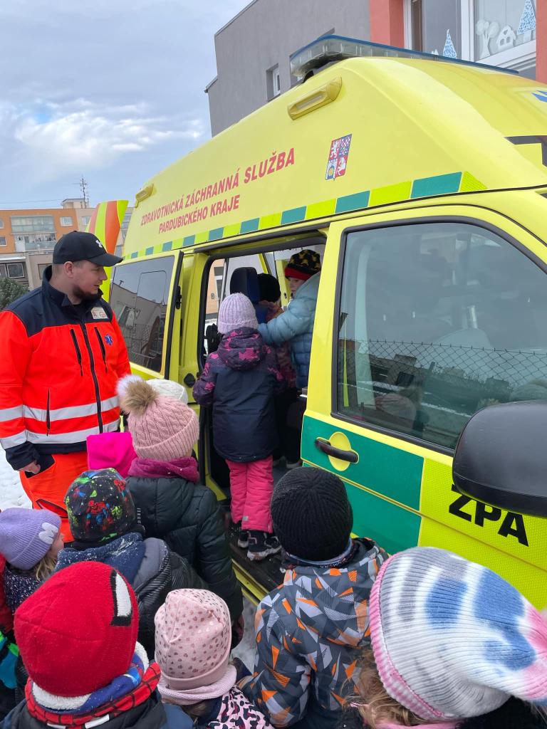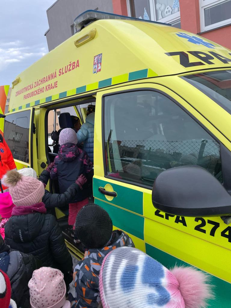 Záchranáři seznámili děti se svou prací, ukázali jim své zařízení a pomůcky. Děti si vše mohly vyzkoušet a dokonce si na závěr prohlédly také záchranářský vůz. Děkujeme záchranářům z Pardubické nemocnice.