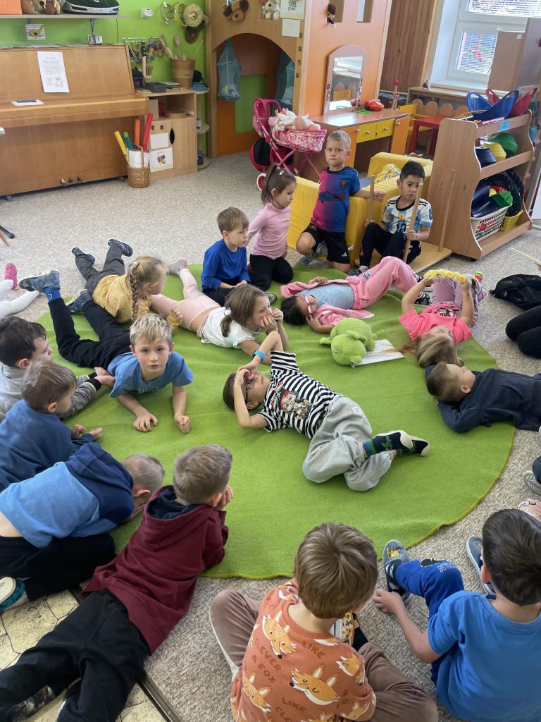 Paní knihovnice navštívila děti z Veverek. Když Veverky nemůžou za knihami, knihy přijdou za nimi.